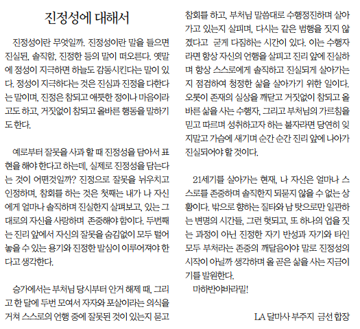2019년 11월 달마사 부주지 금선스님 페이지 정보 작성자 수연심 작성일19-10-30 15:44 조회3,671회 댓글0건 본문 2019년 11월 달마사 부주지 금선스님 댓글목록 등록된 댓글이 없습니다. 이전글 다음글 목록