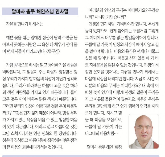 2018년 12월 달마사 총무 해안스님 페이지 정보 작성자 수연심 작성일18-12-08 04:03 조회3,976회 댓글0건 본문 2018년 12월 달마사 총무 해안스님 댓글목록 등록된 댓글이 없습니다. 이전글 다음글 목록