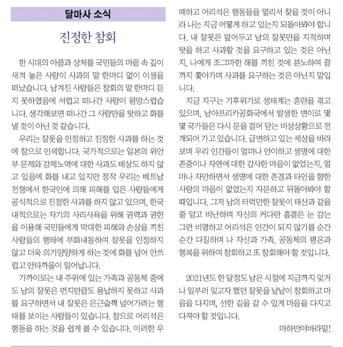 2021년 12월 금선스님 페이지 정보 작성자 수연심 작성일21-12-11 04:15 조회1,792회 댓글0건 본문 2021년 12월 금선스님 댓글목록 등록된 댓글이 없습니다. 이전글 다음글 목록