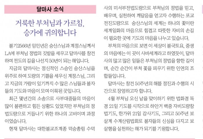 2022년 4월 금선스님 페이지 정보 작성자 수연심 작성일22-04-14 09:29 조회1,265회 댓글0건 본문 2022년 4월 금선스님 댓글목록 등록된 댓글이 없습니다. 이전글 다음글 목록