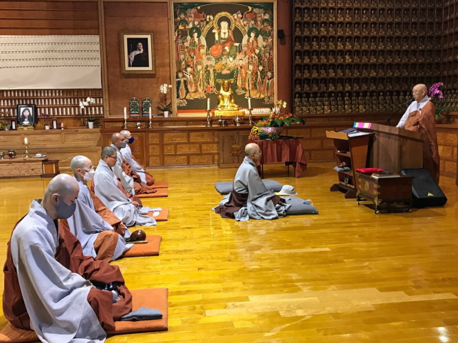 코로나19의 영향으로 최소 인원만이 참석한 가운데 삼귀의, 반야심경, 관욕, 합창, 청법가, 법문, 공지사항, 사홍서원 순으로 진행되었다.
