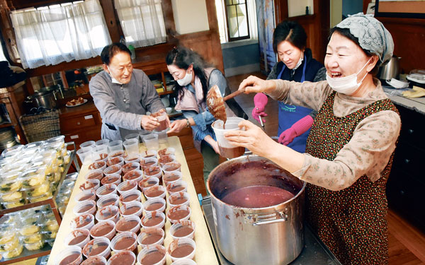 연말을 맞아 LA 한인타운에서 따뜻한 동지팥죽을 나누는 행사가 열렸다. 동지가 22일로 다가온 가운데 19일 대한불교조계종 LA 달마사(주지 금선스님)에서 신도들이 함께 나눌 전통 동지팥죽과 동치미를 푸짐하게 준비하며 즐거워하고 있다.