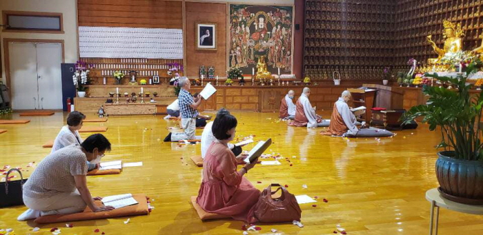 LA 달마사(주지 금선스님)는 지난 7월 12일 49일간 자비수참 참회기도를 입재했다. 법당 좌복 커버는 깨끗이 세탁하고 좌복은 햇빛에 말려 쾌적한 환경에서 수행 정진하기를 바라는 주지스님의 마음이 묻어난다. 하루 빨리 코로나19를 이겨내고 마음껏 부처님을 뵐 수 있기를 기원해본다