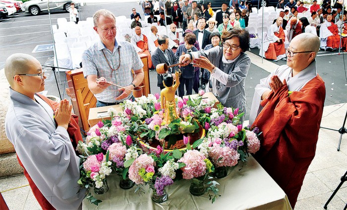 불기 2563년 부처님 오신 날(12일)을 일주일 앞두고 지난 5일 LA 한인타운에 위치한 대한불교 조계종 LA 달마사(주지 정범 스님)에서 남가주 조계종 연합회(회장 현일 스님) 주최로 합동 봉축법회가 열렸다. “마음에 자비를! 세상에 평화를!”이라는 주제로 열린 이날 행사에는 약 200여명의 불자들과 스님들이 참석해서 부처님 탄생의 의미를 되새기며 자비와 지혜의 실천을 다짐했다. 법회에 참석한 불자들이 아기 부처님을 깨끗이 목욕시키는 관불의식을 거행하고 있다.