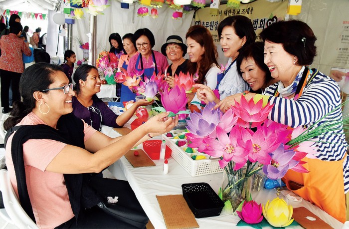 남가주 조계종 연합회 소속 한인 불자들이 지난달 27일 LA 한국축제 장터에 마련된 불교문화체험 부스에서 타인종 주민들과 함께 불교를 상징하는 연꽃을 만들며 한국의 불교문화를 소개하고 있다.