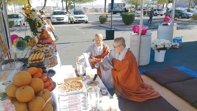 # 전야제는=17일 오후 7시에 시작. 라스베이거스의 사막 바람은 제법 쌀쌀했다. 금강경 독경 기도로 다음날 있을 위령제 도량을 밝히는 의식을 올렸다. 조지아주 전등사에서 온 대현 스님과 도현스님, 텍사스 보현사에서 온 지암 스님과 금선스님, 애리조나주 감로사에서 온 석인스님과 라스베이거스 이대덕화 포교사와 10여 명의 불자들이 참석했다.