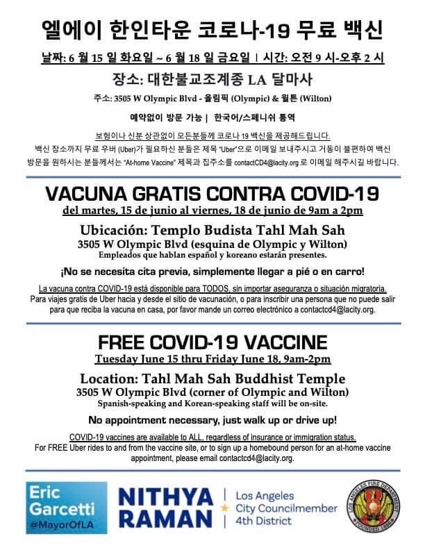 COVID 백신 무료 접종하고 있어요 페이지 정보 작성자 수연심 작성일21-06-24 07:23 조회1,431회 댓글0건 본문 LA County 4지구에서 COVID 백신을 접종하는 이벤트를 달마사 도량에서 진행중입니다.신분증을 지참하고 오시면 누구나 백신을 접종할 수 있다고 합니다.백신 접종은 6월 15일 화요일부터 6월 18일까지 오전 9시부터 오후 2시까지 입니다. 댓글목록 등록된 댓글이 없습니다. 이전글 다음글 목록