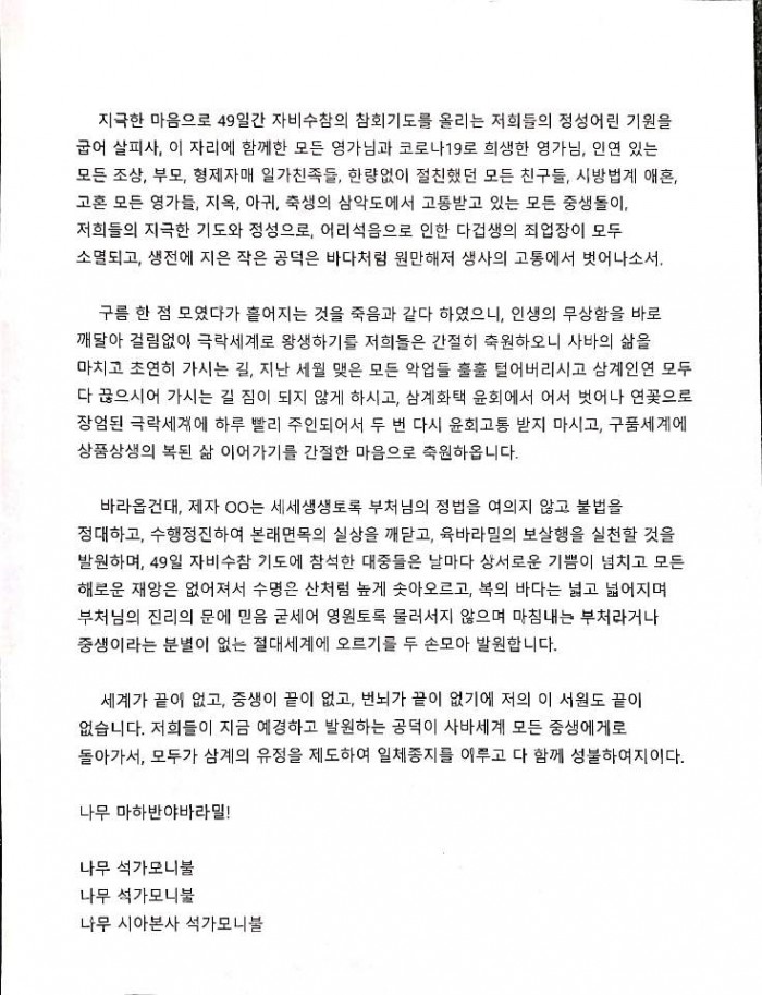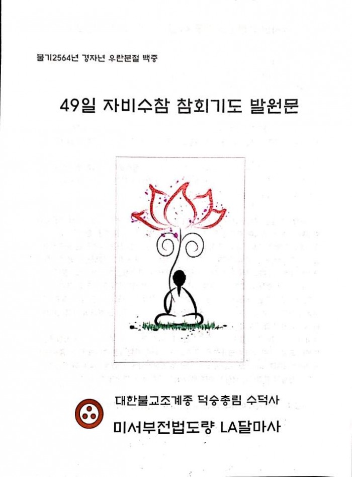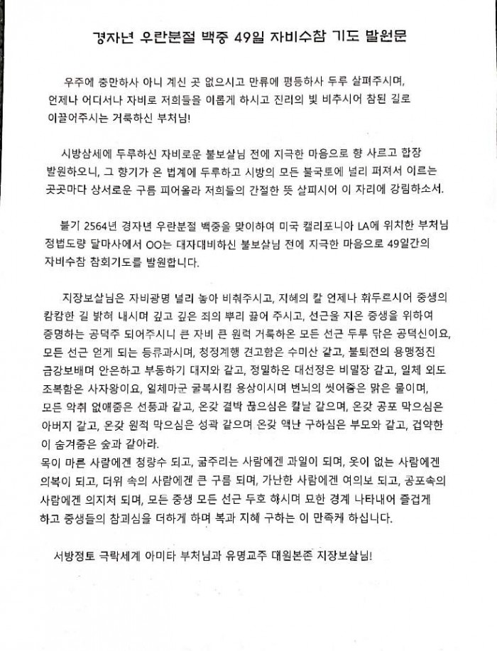 경자년 우란분절 49일 자비수참 참회기도 발원문 페이지 정보 작성자 수연심 작성일20-06-15 06:19 조회2,282회 댓글0건 본문 경자년 우란분절 49일 자비수참 참회기도 발원문 댓글목록 등록된 댓글이 없습니다. 이전글 다음글 목록