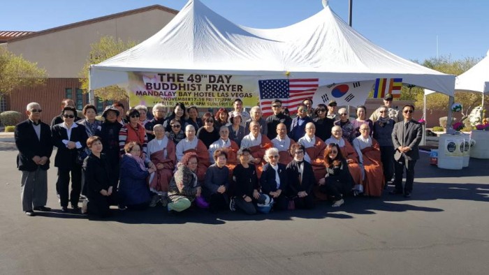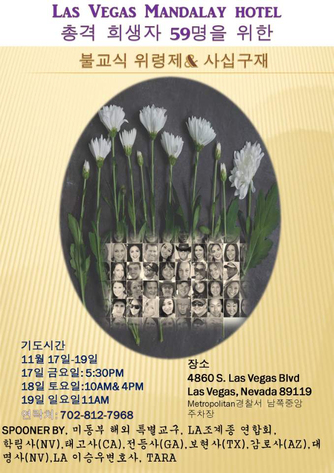 2017년 11월 17일 - 19일 라스베가스 총격사건 위령제 및 49재 페이지 정보 작성자 수연심 작성일17-11-21 23:10 조회3,138회 댓글0건 본문 라스베가스 맨델레이호텔 총격희생자 추모를 위한 위령제 및 49재가라스베가스 메트로폴리탄 경찰서에서 봉행되었습니다주지스님이신 정범스님과 무량스님 그리고 연합합창단 및 신도님 포함 15분도18일 행사에 참석하였습니다. 댓글목록 등록된 댓글이 없습니다. 이전글 다음글 목록
