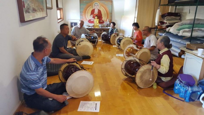 장단에 맞춰 장고치는 소리가 법당밖까지