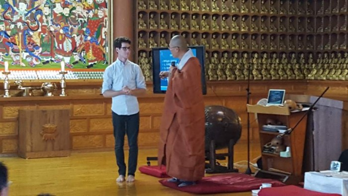 청년이 인터넷을 보고 법회에 참석했다.