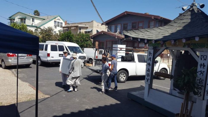 요사채 옆에 임시 씽크대를 설치하고 포도밭에 신도님들이