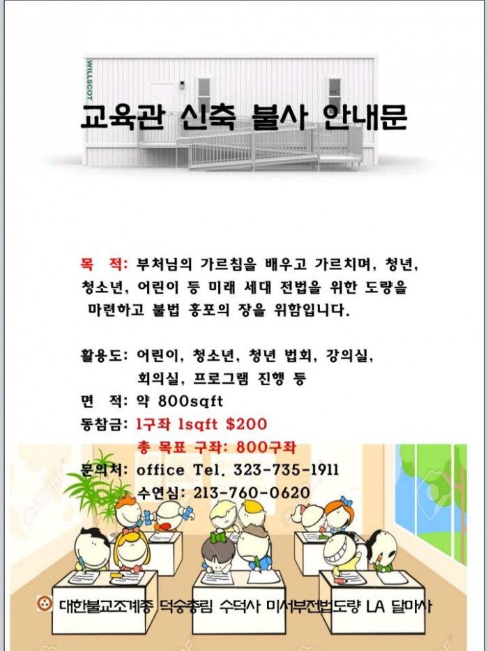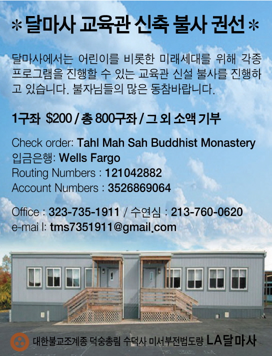 교육관 신축 불사 안내문 페이지 정보 작성자 수연심 작성일20-02-07 04:04 조회6,214회 댓글0건 본문 부처님의 가름침을 배우고 가르치며 청년, 청소년,어린이등 미래 세대 전법을 위한 도량을마련하고 불법 홍보의 장을 위한 교육관 신축 불사를 합니다.1구좌에 $200 총 목표 구좌는 800 구좌입니다. 댓글목록 등록된 댓글이 없습니다. 이전글 다음글 목록