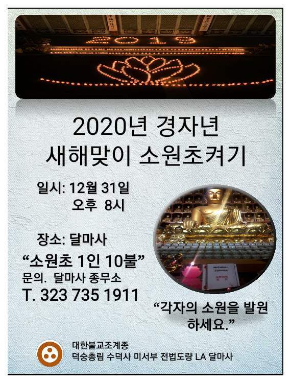 2020년 경자년 새해맞이 소원초 켜기 페이지 정보 작성자 수연심 작성일19-11-23 15:56 조회4,716회 댓글0건 본문 2019년 12월 31일 오후 8시 각자의 소원을 발원하면서 소원초를 켜보세요 댓글목록 등록된 댓글이 없습니다. 이전글 다음글 목록