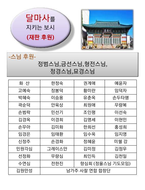 달마사 도량수호 불사 (재판 후원) 페이지 정보 작성자 수연심 작성일19-06-18 11:19 조회4,767회 댓글0건 본문 달마사를 지키는 도량수호 불사(재판후원)에 동참해주신 신도분들께 부처님의 가피가 함께 하기를 기원합니다. 댓글목록 등록된 댓글이 없습니다. 이전글 다음글 목록