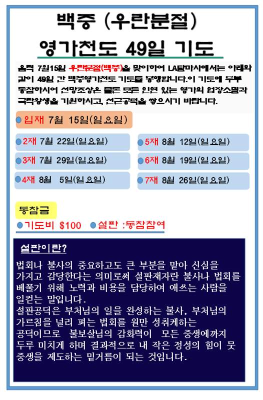 백중 49재 천도기도에 모든 보살님들이 함께 동참하셔서 큰 공덕 이루시기를 바랍니다.