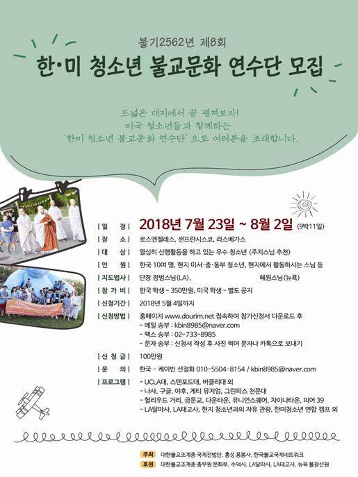한 미 청소년 불교문화 연수단 방문 페이지 정보 작성자 수연심 작성일18-07-21 02:57 조회5,809회 댓글0건 본문 7월 23일부터 8월 2일까지 제 8차 한미 청소년 불교문화 연수단팀이 남가주를 방문합니다.23일부터 26일까지는 달마사에서 템플 스테이를 하면서 LA근방 뮤지엄, 천문대,헐리우드, UCLA, USC, 서래사등을 방문할 예정입니다. 댓글목록 등록된 댓글이 없습니다. 이전글 다음글 목록