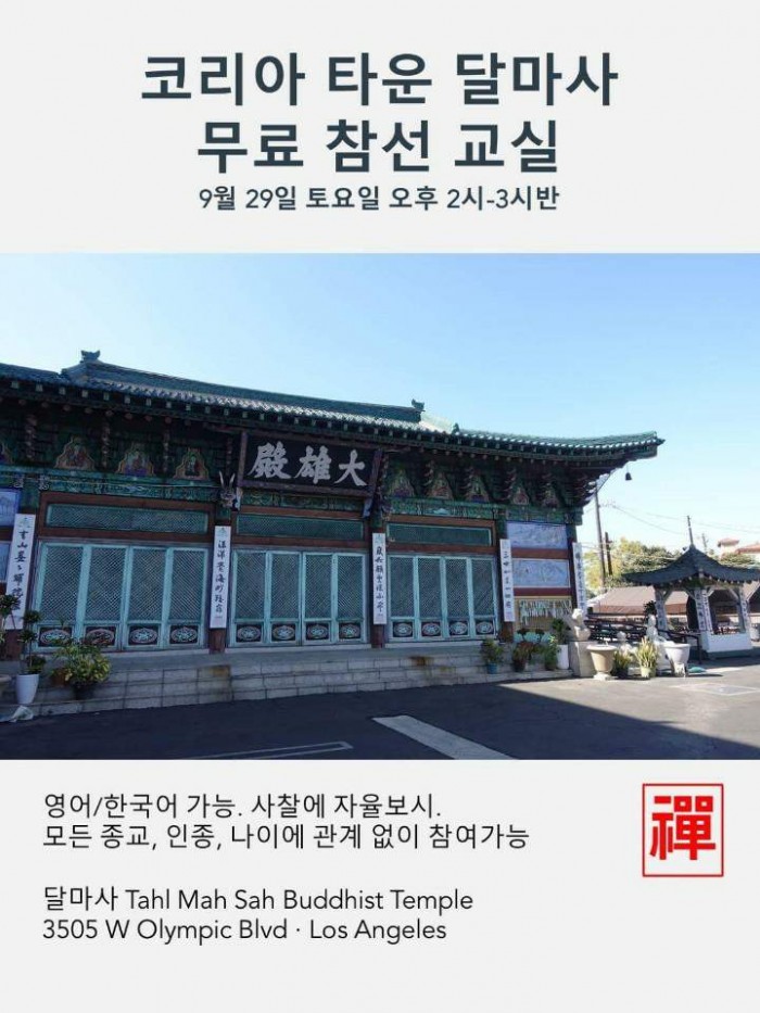 참선 교실 페이지 정보 작성자 수연심 작성일18-09-26 15:14 조회5,748회 댓글0건 본문 9월 29일 오후 2시부터 달마사 법당에서 참선 교실을 합니다.Shanna Han보살님의 지도하에 모든 종교, 인종, 나이에 관계없이 누구든지 동참하실수 있습니다. 댓글목록 등록된 댓글이 없습니다. 이전글 다음글 목록