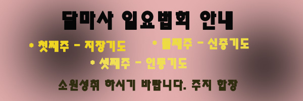달마사 일요법회 안내 페이지 정보 작성자 최고관리자 작성일18-10-31 17:20 조회6,645회 댓글0건 본문 일요법회는 달마사 대웅전에서 오전 11시에 있습니다. 댓글목록 등록된 댓글이 없습니다. 이전글 다음글 목록
