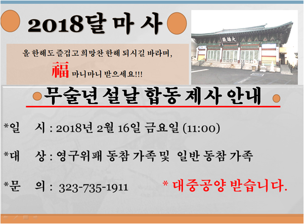 설 합동차례 페이지 정보 작성자 수연심 작성일18-01-31 03:28 조회5,626회 댓글0건 본문 2018년 무술년 새해를 맞이하여 조상님의 음덕을 기리며 선망조상님께부처님의 가르침을 전해드릴수 있도록 설 합동차례를 올리고 있습니다.설 합동차례는 2월 16일 오전 11시에 봉행합니다.무술년 새해를 맞이하여 돌아가신 조상님들을 기리는 뜻깊은 날이되기를 바랍니다. 댓글목록 등록된 댓글이 없습니다. 이전글 다음글 목록