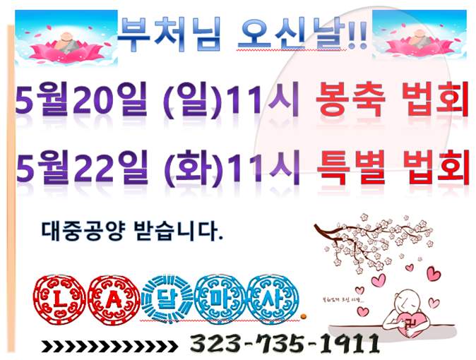 부처님오신날 행사 페이지 정보 작성자 수연심 작성일18-05-05 02:57 조회5,661회 댓글0건 본문 5월 22일 부처님오신날를 맞이하여 달마사에서는 5월 20일 봉축법회와 5월22일 특별법회를합니다. 댓글목록 등록된 댓글이 없습니다. 이전글 다음글 목록