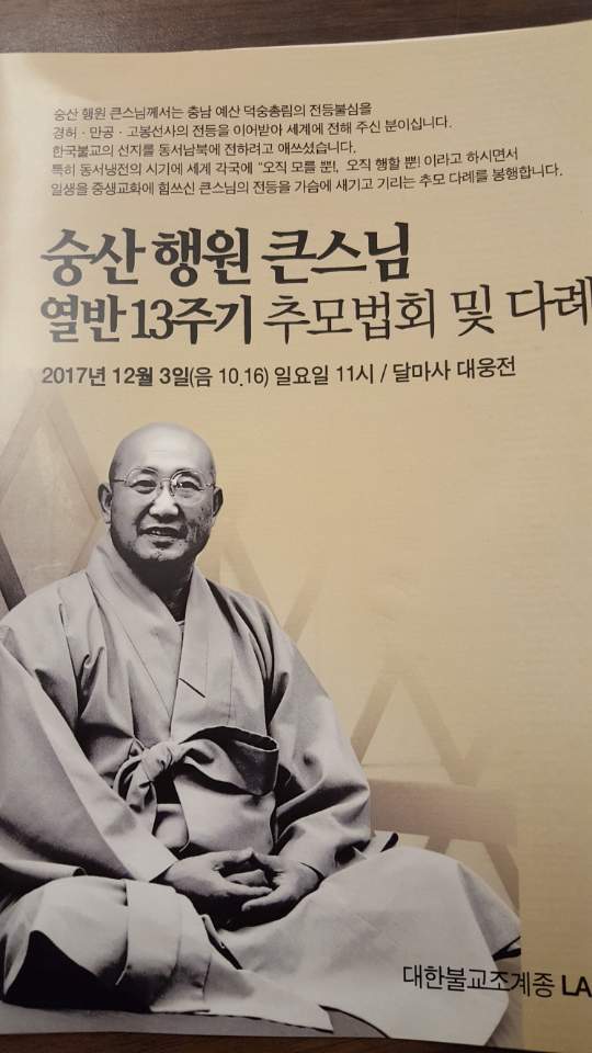 숭산 행원 큰스님 추모다례 페이지 정보 작성자 수연심 작성일17-12-01 01:13 조회5,533회 댓글0건 본문 숭산 행원 큰스님 열반 13주기 추모법회 및 다례재를 12월 3일 일요일 오전 11시 달마사 대웅전에서 봉행합니다.한국불교의 선지를 동서남북에 전하려고 애쓰셨던 큰스님의 전등을가슴에 새기고 기리는 추모댜례에 많은 동참바랍니다. 댓글목록 등록된 댓글이 없습니다. 이전글 다음글 목록