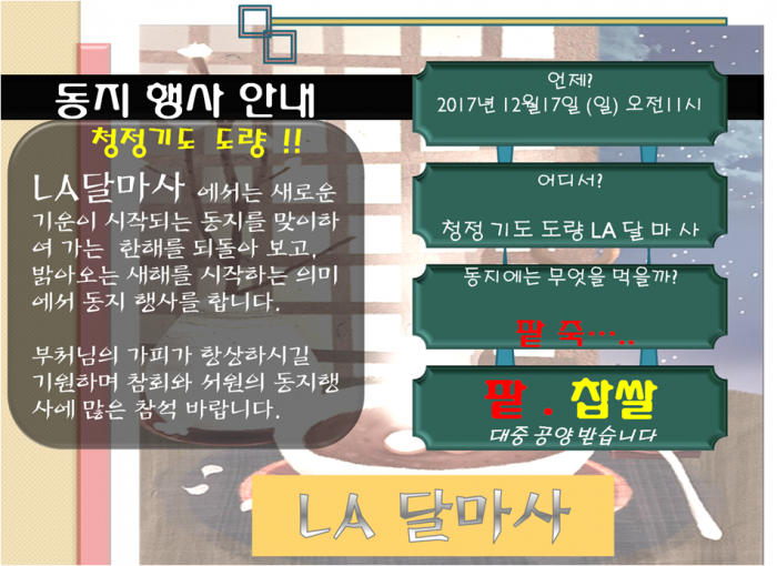 동지 팥죽 페이지 정보 작성자 수연심 작성일17-12-10 13:41 조회5,313회 댓글0건 본문 12월 17일 일요법회날 동지 팥죽 공양을 합니다. 정성껏 새알심 만들어 준비하겠습니다. 모두 오세요. 댓글목록 등록된 댓글이 없습니다. 이전글 다음글 목록