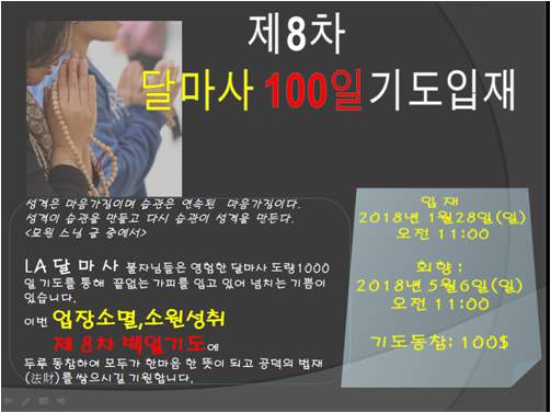 8차 백일기도 입재 페이지 정보 작성자 수연심 작성일17-12-22 07:45 조회5,285회 댓글0건 본문 천일기도중 7차 백일기도 회향이 12월 31일에 끝나고 8차 백일기도 입재를 무술년 1월 28일에 시작합니다. 댓글목록 등록된 댓글이 없습니다. 이전글 다음글 목록