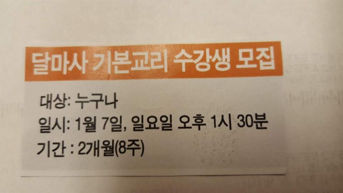 불교 기본교리 수강생 모집 페이지 정보 작성자 수연심 작성일17-12-31 00:37 조회5,487회 댓글0건 본문 매주 일요일 오후 1시 30분터 불교 기본교리 강좌를 시작합니다.불교에 관심있는 분, 2개월 과정으로 1월 7일 첫강의가 있습니다. 댓글목록 등록된 댓글이 없습니다. 이전글 다음글 목록