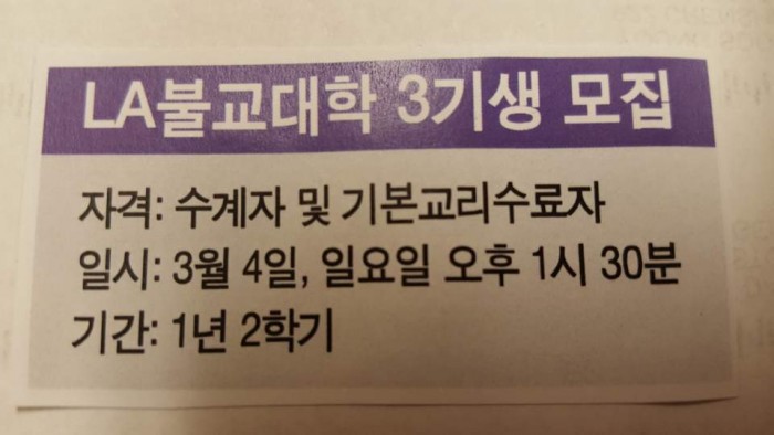 LA 불교대학 3기생 모집 페이지 정보 작성자 수연심 작성일17-12-31 00:40 조회5,558회 댓글0건 본문 LA 불교대학에서는 3기생을 모집합니다.기본교리 수료자 및 수계자는 누구든지 공부할수 있습니다.3월 4일 개강하며 1년 2학기 과정으로 진행됩니다. 댓글목록 등록된 댓글이 없습니다. 이전글 다음글 목록