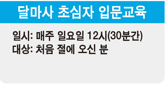 초심자 입문 교육 안내 페이지 정보 작성자 최고관리자 작성일17-08-02 10:49 조회5,679회 댓글0건 본문 매주 일요일 12시부터 30분간 처음에 오시는 신도님들을 위한 입문 교육을 합니다.절에 왔을 때 느끼는 당황스러움!이젠 달마사 스님들과 함께하나하나 배워 보시기 바랍니다 댓글목록 등록된 댓글이 없습니다. 이전글 다음글 목록