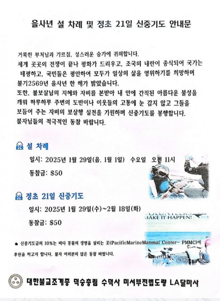 을사년 설 차례 및 정초 12일 신중기도 안내 페이지 정보 작성자 수연심 작성일24-12-31 11:43 조회1,287회 댓글0건 본문 설 차례 - 2025년 1월 29일 오전 11시 동참금 $50정초 21일 신중기도 - 2025년 1월 29일 - 2월 18일 동참금 $50 댓글목록 등록된 댓글이 없습니다. 이전글 다음글 목록