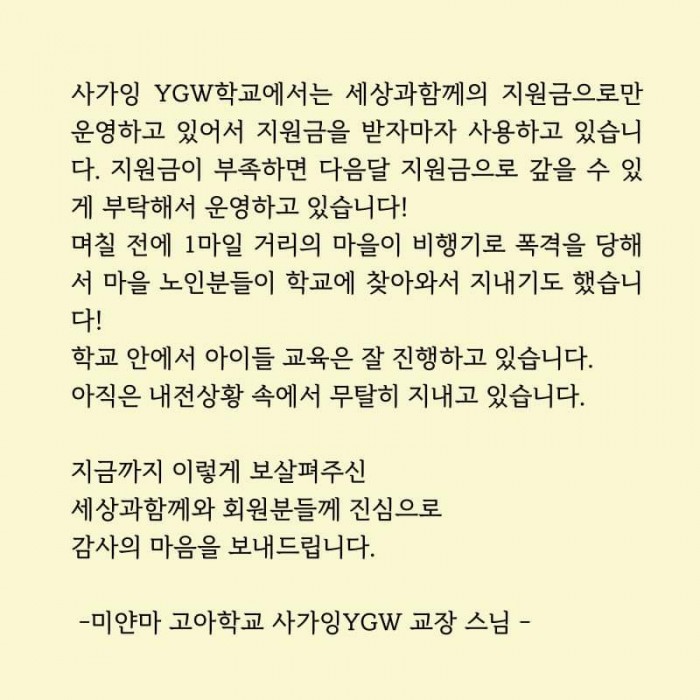 미얀마 고아학교 사가잉 YGW 학교 스님 감사글 페이지 정보 작성자 수연심 작성일23-12-27 11:52 조회1,743회 댓글0건 본문 미얀마 고아학교 사가잉 YGW 학교 스님 감사글 댓글목록 등록된 댓글이 없습니다. 이전글 다음글 목록