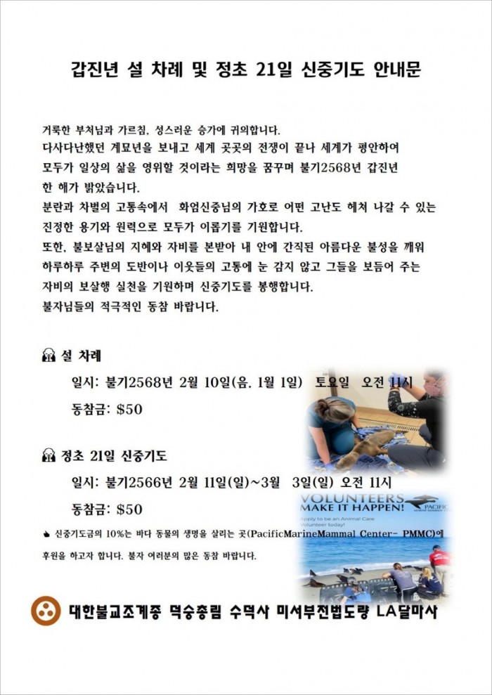 갑진년 정초 21일 신중기도 페이지 정보 작성자 수연심 작성일24-01-14 11:29 조회1,669회 댓글0건 본문 * 갑진년 정초 21일 신중기도 일시 : 불기 2568년 2월 11일 - 3월 3일 동참금 : $50.00* 신중 기도금의 10%는 바다 동물의 생명을 살리는곳 (PMMC)에 후원을 하고자 합니다. 댓글목록 등록된 댓글이 없습니다. 이전글 다음글 목록