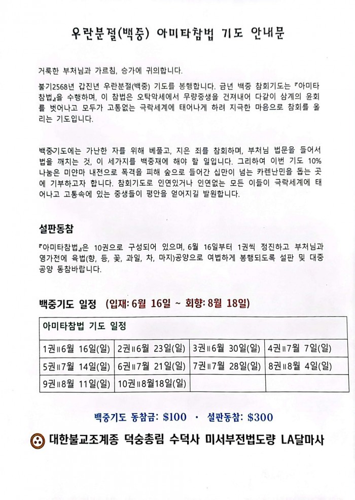우란분절 아미타참법 기도 안내문