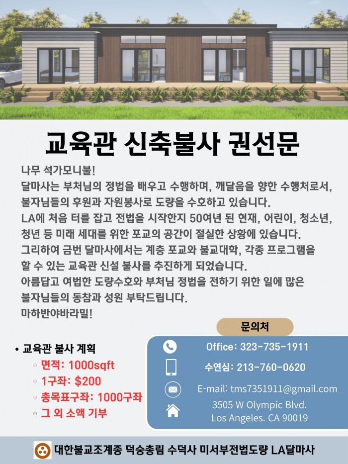 교육관 신축불사 권선문 페이지 정보 작성자 수연심 작성일23-07-24 07:00 조회2,018회 댓글0건 본문 * 교육관 불사 계획 면적 : 1000 sqft 1구좌 : $200.00 총 목표구좌 : 1000구좌 댓글목록 등록된 댓글이 없습니다. 이전글 다음글 목록