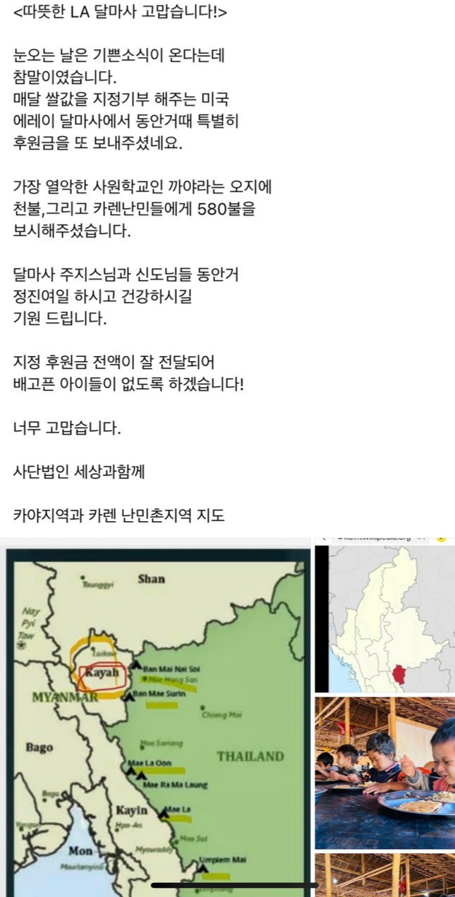 임인년 동안거 백일기도 나눔 보고 페이지 정보 작성자 수연심 작성일22-12-20 11:34 조회1,953회 댓글0건 본문 임인년 동안거 백일기도 10% 나눔 보고입니다.10% $750불과 일반 후원금 $830해서 $1000은 미얀마 카야 지역 아이들에게 $580은 카렌 난민들에게 추운 겨울 잘 이겨내라고 후원하였습니다.세상과 함께 이사장 스님의 글 공유합니다.불자 가족 여러분 감사합니다. 댓글목록 등록된 댓글이 없습니다. 이전글 다음글 목록