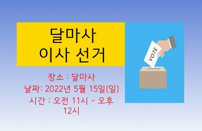 달마사 이사 선거 페이지 정보 작성자 수연심 작성일22-04-14 09:22 조회2,024회 댓글0건 본문 달마사 이사 선거장소 : 달마사날짜 : 2022년 5월 8일 (일)시간 : 오전 11시 댓글목록 등록된 댓글이 없습니다. 이전글 다음글 목록