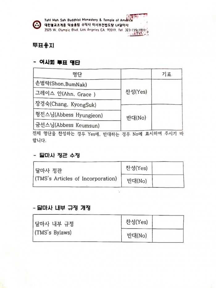 2022년 달마사 이사 선거 결과 보고 페이지 정보 작성자 수연심 작성일22-05-18 04:18 조회2,155회 댓글0건 본문 2022년 5월 달마사 이사 선거와 달마사 Article 및 By Law 개정에 대한 투표를 하였습니다.과반수 이상 참석률과 99% 찬성으로 통과하였습니다.앞으로 2년간 달마사를 운영할 새로운 이사님 명단입니다.(금선스님,형전스님,그레이스안,손범락,장경숙) 댓글목록 등록된 댓글이 없습니다. 이전글 다음글 목록