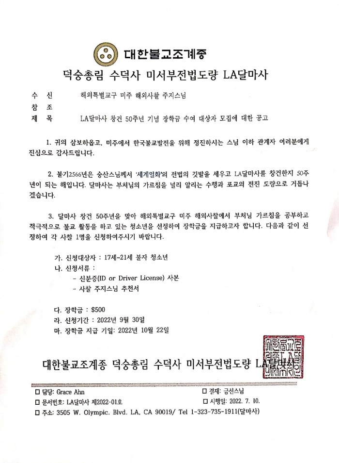 달마사 창건 50주년을 맞아 해외특별교구 미주 해외사찰에서 부처님 가르침을 공부하고 적극적으로 볼교 활동을 하고 있는 청소년을 각 사찰 1명씩 선정하여 장학금을 지급 할려고 합니다.