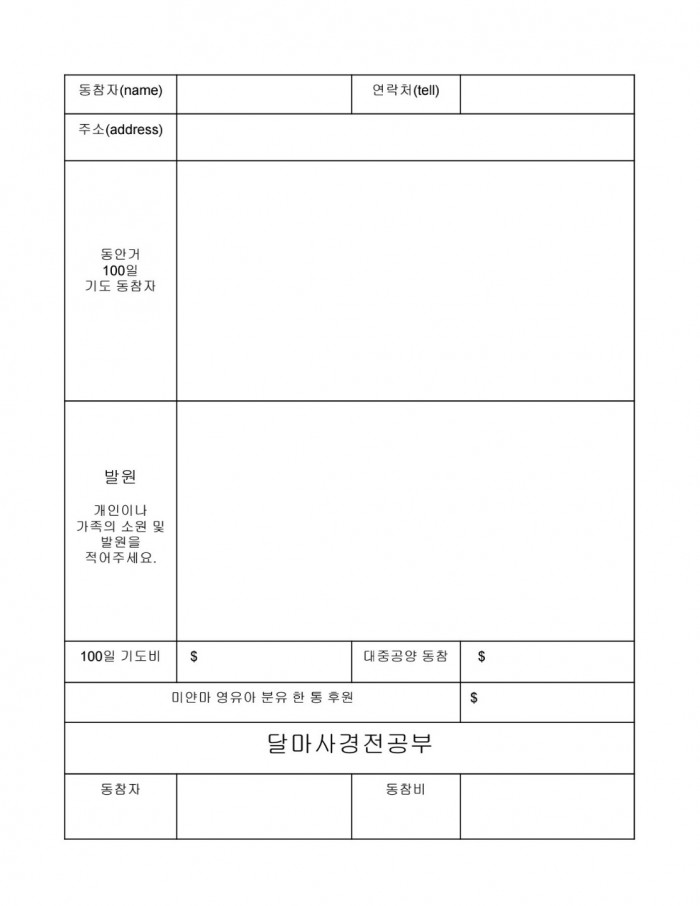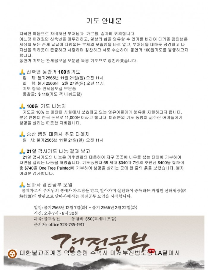 신축년 동안거 기도 안내문 페이지 정보 작성자 수연심 작성일21-11-09 18:58 조회2,804회 댓글0건 본문 * 신축년 동안거 백일기도 * 입재 : 불기 2565년 11월 21일 (일) 오전 11시회향 : 불기 2566년 2월 27일 (일) 조전 11시 기도 항목 : 관세음보살 보문품동참금 : $110 (기도 책 나눠드림) 댓글목록 등록된 댓글이 없습니다. 이전글 다음글 목록