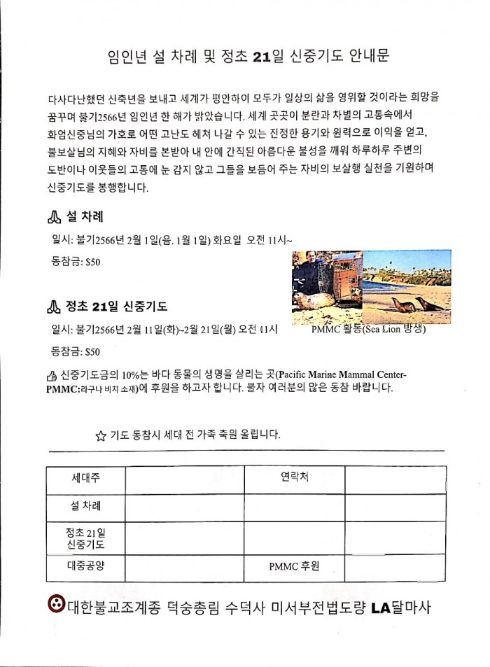 임인년 정초 21일 신중기도 페이지 정보 작성자 수연심 작성일22-01-05 10:20 조회2,388회 댓글0건 본문 일시 : 불기 2566년 2월 1일 (화) - 2월 21일 (월) 오전 11시동참금 : $50 * 신중 기도금의 10%는 바다 동물의 생명을 살리는 곳 PMMC (pacific Marine Mammal Center)에 후원을 하고자 합니다. 불자 여러분의 많은 동참 바랍니다. 댓글목록 등록된 댓글이 없습니다. 이전글 다음글 목록