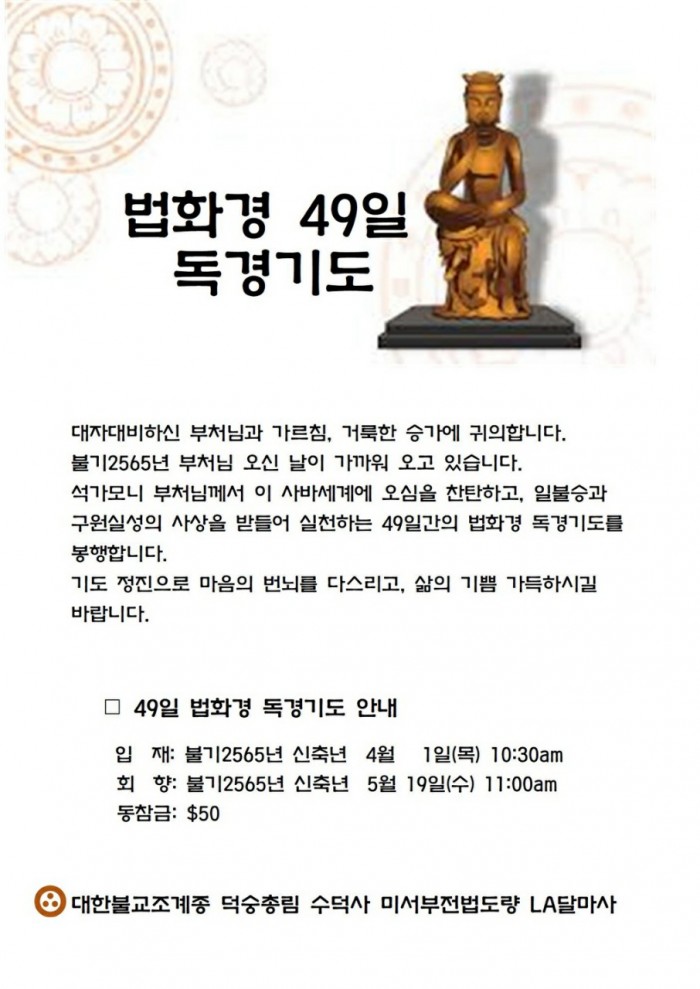 불기 2565년 4월1일부터 부처님께서 이 사바세계에 오심을 찬탄하고 그 가르침을 배우고 일불승과 구원실성의 사사을 받들어 실천하는 49일간의 법화경 독경기도를 시작합니다.