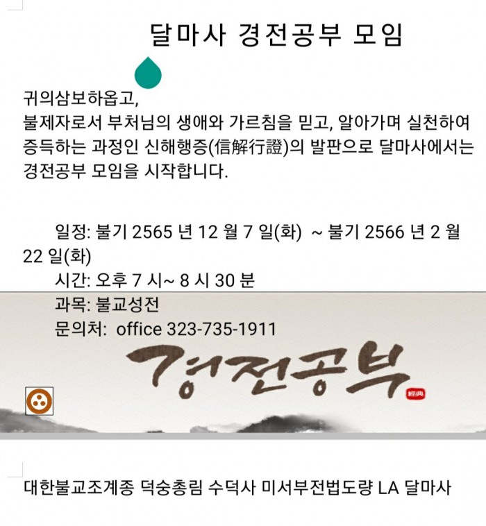 경전공부 모임 페이지 정보 작성자 수연심 작성일21-10-14 07:58 조회2,634회 댓글0건 본문 불제자로서 부처님의 생애와 가르침을 믿고 알아가며 실천하여 증득하는 과정인 신해행증의 발판으로경전공부 모임을 시작합니다. 일정 : 불기 2565년 12월 7일(화) - 불기 2566년 2월 22일(화)시간 : 오후 7시 - 8시30분과목 : 불교성전 댓글목록 등록된 댓글이 없습니다. 이전글 다음글 목록