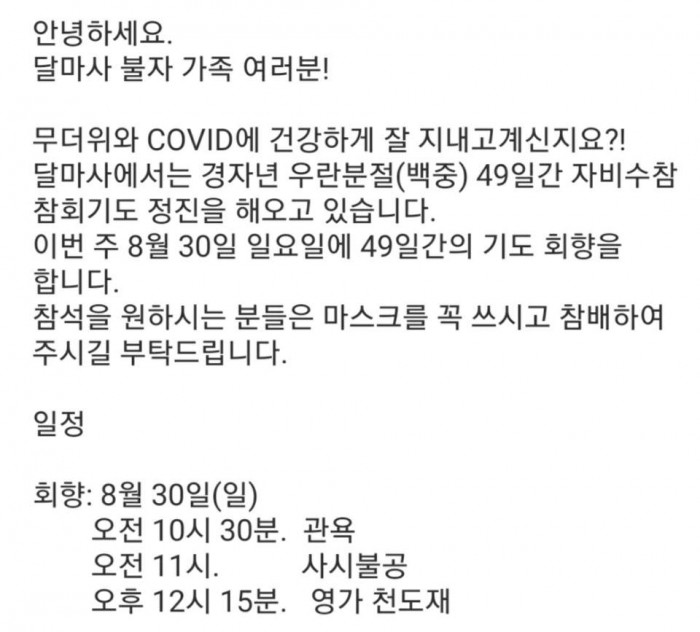 백중 자비수참 49일기도 회향 공지문 페이지 정보 작성자 수연심 작성일20-08-29 08:09 조회3,759회 댓글0건 본문 백중 자비수참 49일기도 회향 공지문 댓글목록 등록된 댓글이 없습니다. 이전글 다음글 목록