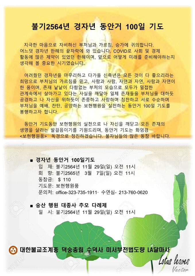 경자년 동안거 백일기도 입재 페이지 정보 작성자 수연심 작성일20-10-22 01:29 조회3,530회 댓글0건 본문 불기 2564년 경자년 동안거 100일기도 * 입재 ㅡ 불기 2564년 11월 29일 * 회향 ㅡ 불기 2565년 3월 7일 * 동참금 ㅡ 110불 * 기도문 ㅡ 보현행원품 댓글목록 등록된 댓글이 없습니다. 이전글 다음글 목록