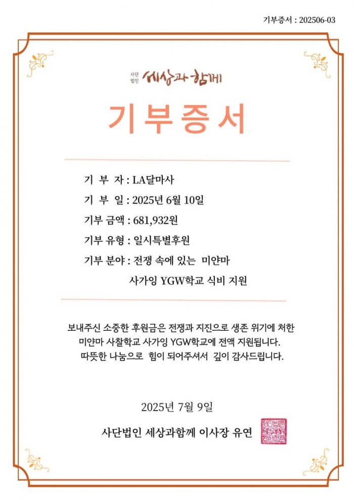 미얀마 사가잉 학교 기부증서 6월 페이지 정보 작성자 수연심 작성일25-07-16 02:10 조회1,026회 댓글0건 본문 미얀마 사가잉 학교 기부증서 6월 댓글목록 등록된 댓글이 없습니다. 이전글 다음글 목록